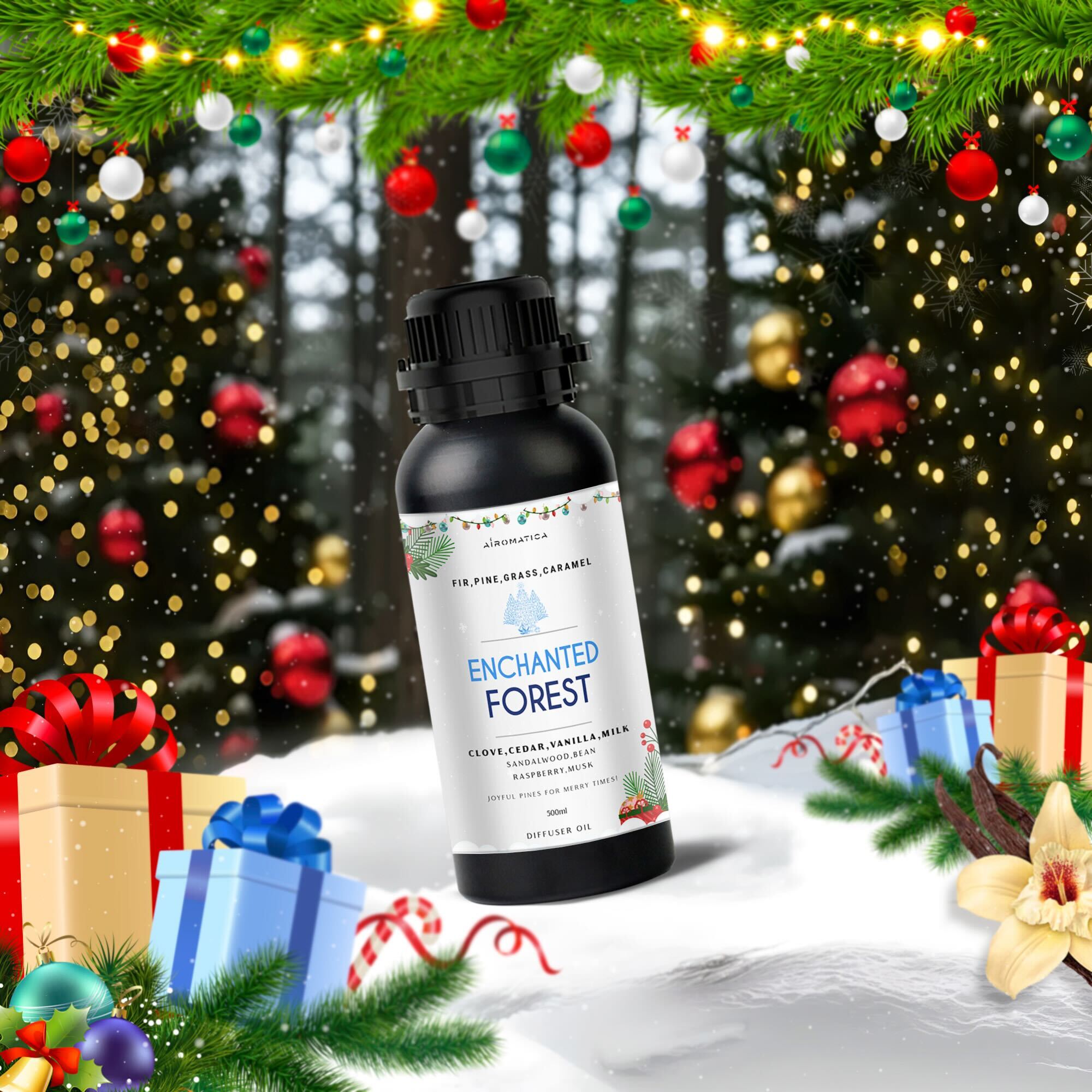 Step into a world where magic meets mystery — a limited-edition scent that captures the wonder of nature wrapped in midnight luxury. Enchanted Forest opens with a sparkling fusion of fir, pine, and fresh-cut grass, kissed with golden caramel that glows like lantern light through the trees. The heart deepens into a comforting blend of clove, cedar, and creamy vanilla milk — a cozy invitation to linger beneath the evergreens. Finally, the base unfolds in a trail of velvety sandalwood, tonka-like bean, and soft musk, sweetened by a touch of wild raspberry — a signature that feels both untamed and irresistibly warm.